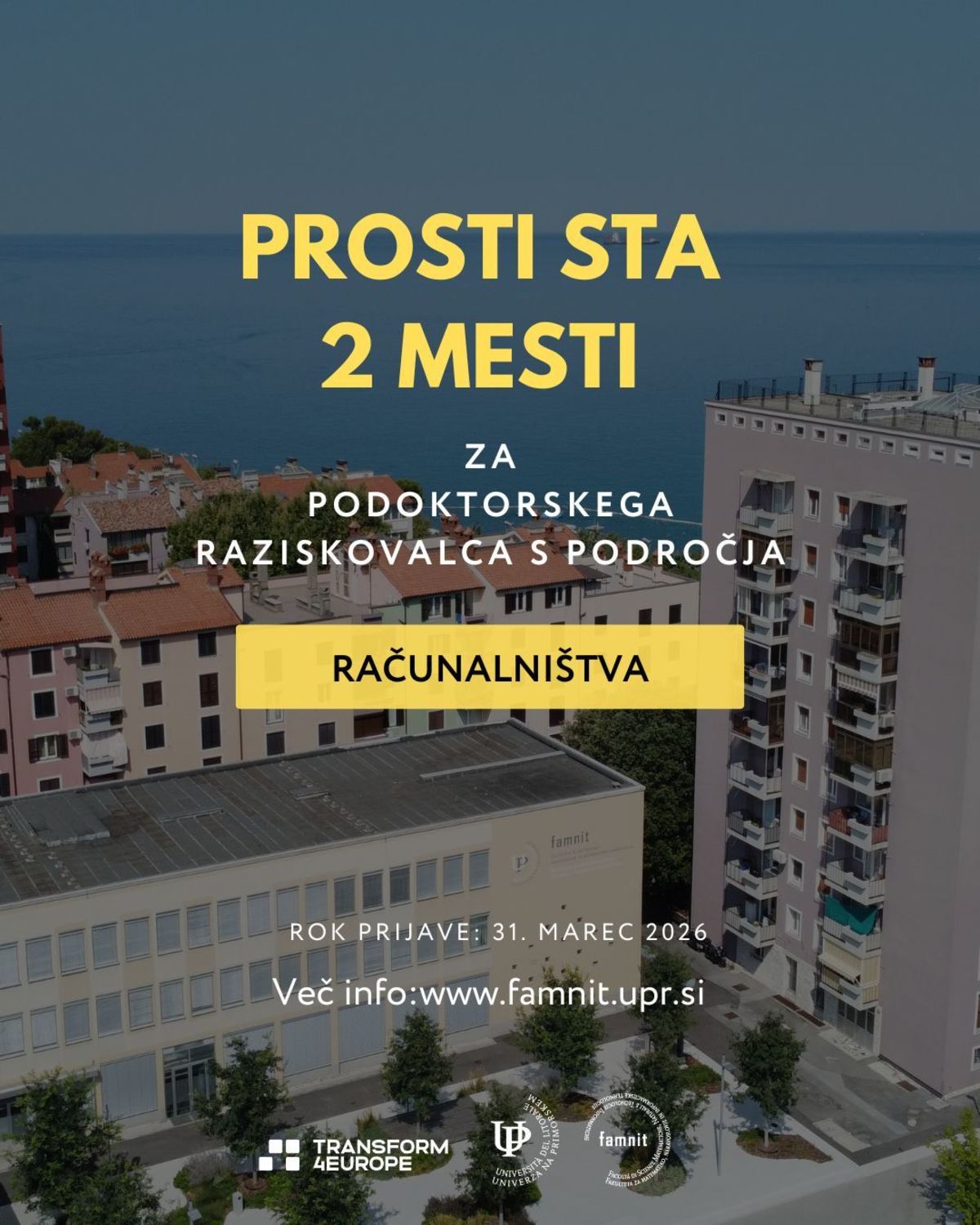Univerza na Primorskem, Fakulteta za matematiko, naravoslovje in informacijske tehnologije (UP FAMNIT) vabi k prijavi izjemne kandidate z močnim raziskovalnim opusom na področju računalništva, ki so motivirani za razvoj samostojnega raziskovanja in za prispevanje k pripravi konkurenčnih projektnih predlogov.