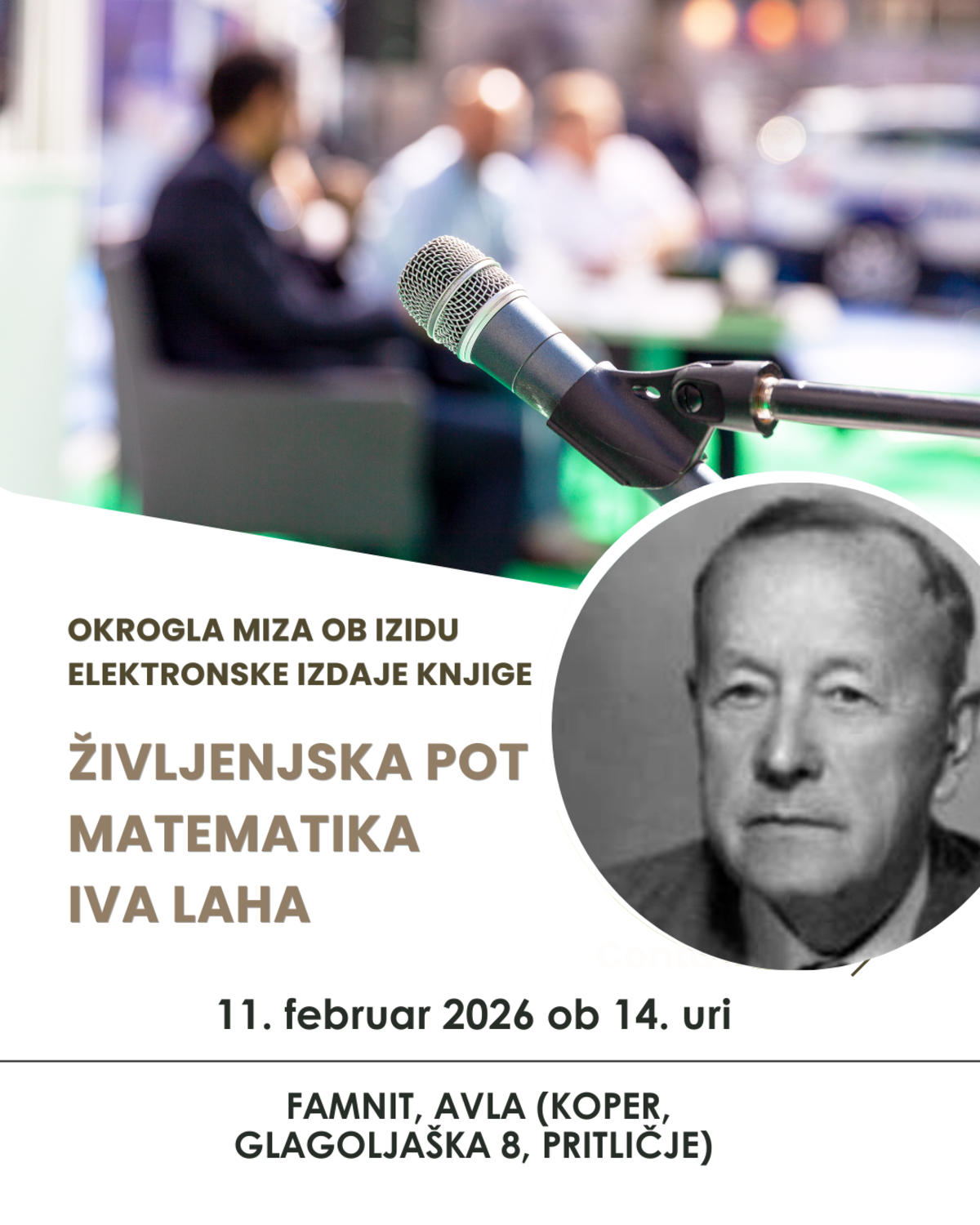 Vabljeni na okroglo mizo ob izidu elektronske izdaje knjige »Življenjska pot matematika Iva Laha«  avtorja Janeza Mulca, ki jo je izdala Univerza na Primorskem ter znamke »Ivo Lah 130 let rojstva«, ki jo je izdala Pošta Slovenije. Univerza na Primorskem, FAMNIT, Avla (pritličje), Koper, Glagoljaška ul. 8, 11. februar 2026 ob 14. uri. Okroglo mizo vodi prof. dr. Simona Kustec , glavna urednica Založbe Univerze na Primorskem. več...
