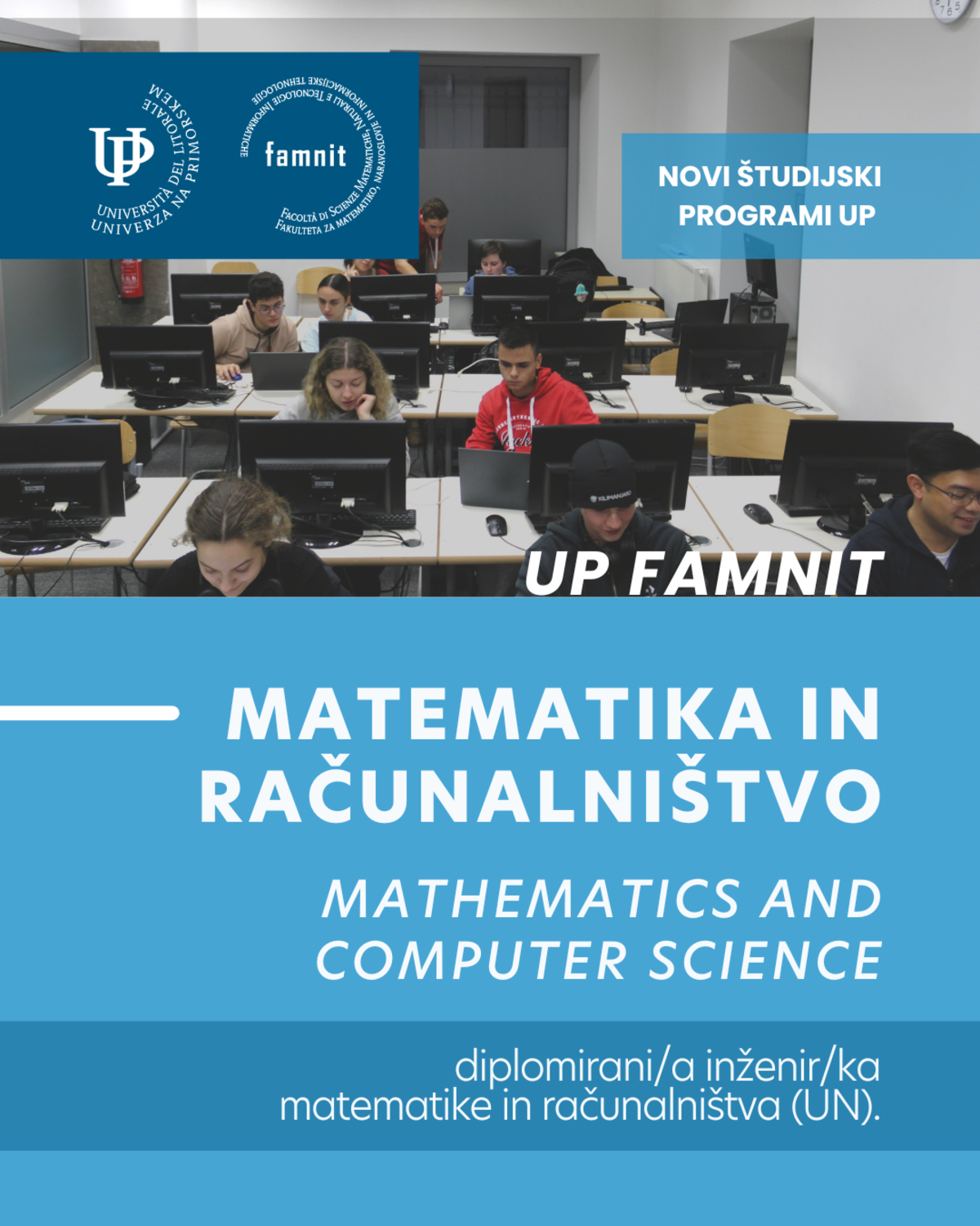 Senat Univerze na Primorskem je na 27. redni seji dne 21. januarja 2026 sprejel nov univerzitetni študijski program Matematika in računalništvo. Gre za interdisciplinarni študijski program, ki izobražuje bodoče strokovnjake s trdno matematično podlago in poglobljenimi računalniškimi znanji, zlasti na področjih načrtovanja programske opreme in teorije algoritmov, ki sta v jedru sodobne industrije umetne inteligence ter informacijske tehnologije z visoko dodano vrednostjo. Študijski program bo vključen v razpis za vpis v dodiplomske študijske programe Univerze na Primorskem v študijskem letu 2026/2027. več...